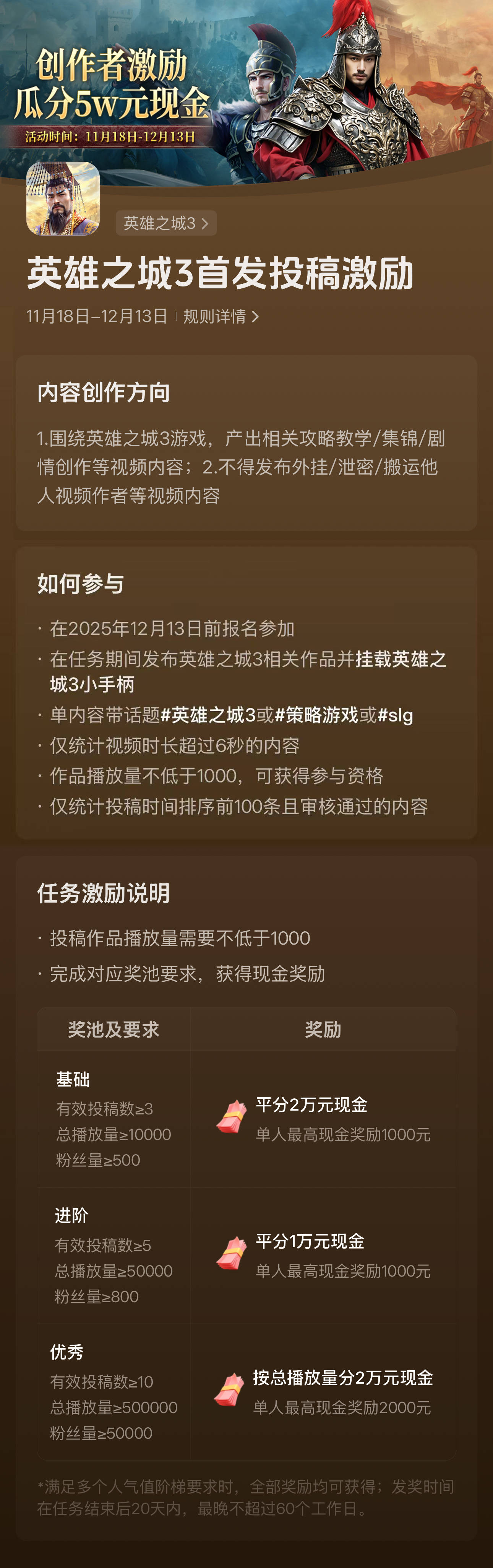 为激发各位城主的创作豪情,《英雄之城3》抖音专属创作激励活动重磅上线——5万总奖池已备好,视频赛道火力全开,就等你来用镜头续写传奇!