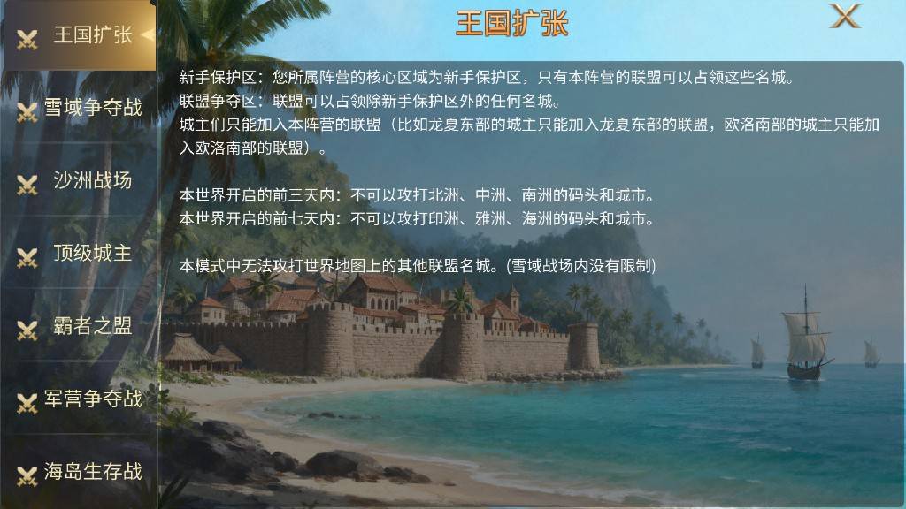 3、前期节奏调整:开服前期设置不同阶段的攻打保护期,普通服和平时代不可攻击北洲、中洲、南洲的码头和城市;王国争霸、文明远征模式中,本世界开启前3天内不可攻打北洲、中洲、南洲的码头和城市,前7天内不可攻打印洲、雅洲、海洲的码头和城市,降低新手期压力,让发展节奏更为舒适。