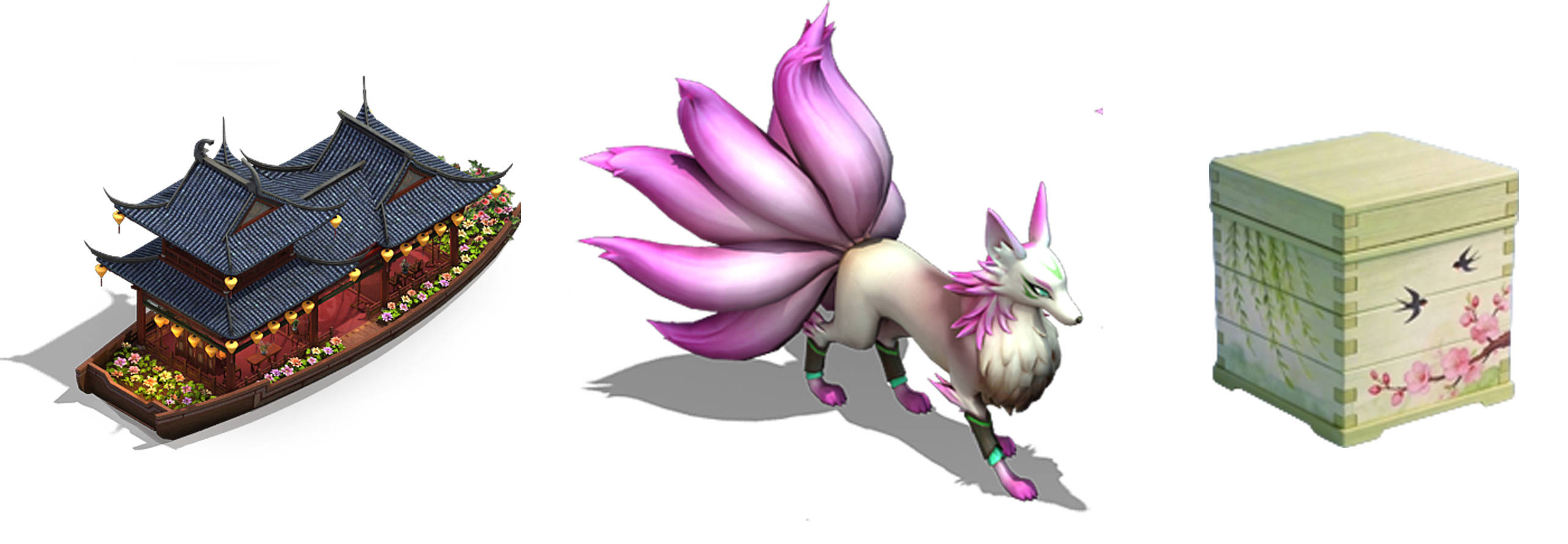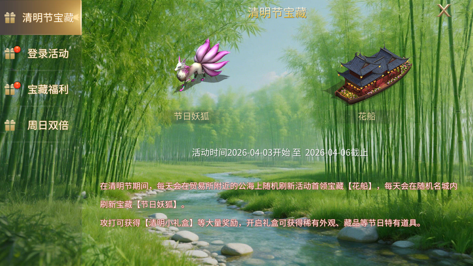 2、清明节期间(4月3日-4月6日)每天会在贸易所附近的公海上随机刷新活动首领宝藏【花船】,每天会在随机名城内刷新宝藏【节日妖狐】。攻打可获得【清明小礼盒】等大量奖励,开启礼盒可获得稀有外观、藏品等节日特有道具。有一定概率可直接获得清明节专属坐骑外观——妖狐!